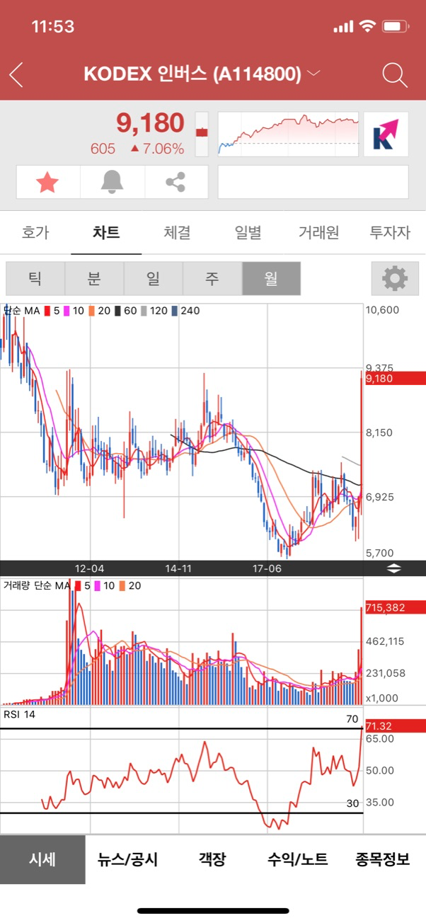 제가 주식을 열심히 하는 편은 아니지만 조금씩 해보는 편인데요. 언젠지 기억도 안 나지만 예~전에 KODEX 인버스를 조금 샀던 적이 있었습니다. 앞으로 경제가 점점 나빠지겠거니 하면서 8000원 가까이할 때 샀었는데요. 제 예상과는 다르게 계속 떨어졌었습니다. 5000원대까지도 갔었네요. 하지만 최근 급등해서 9천 원을 넘기면서 수익이 나기 시작했습니다.