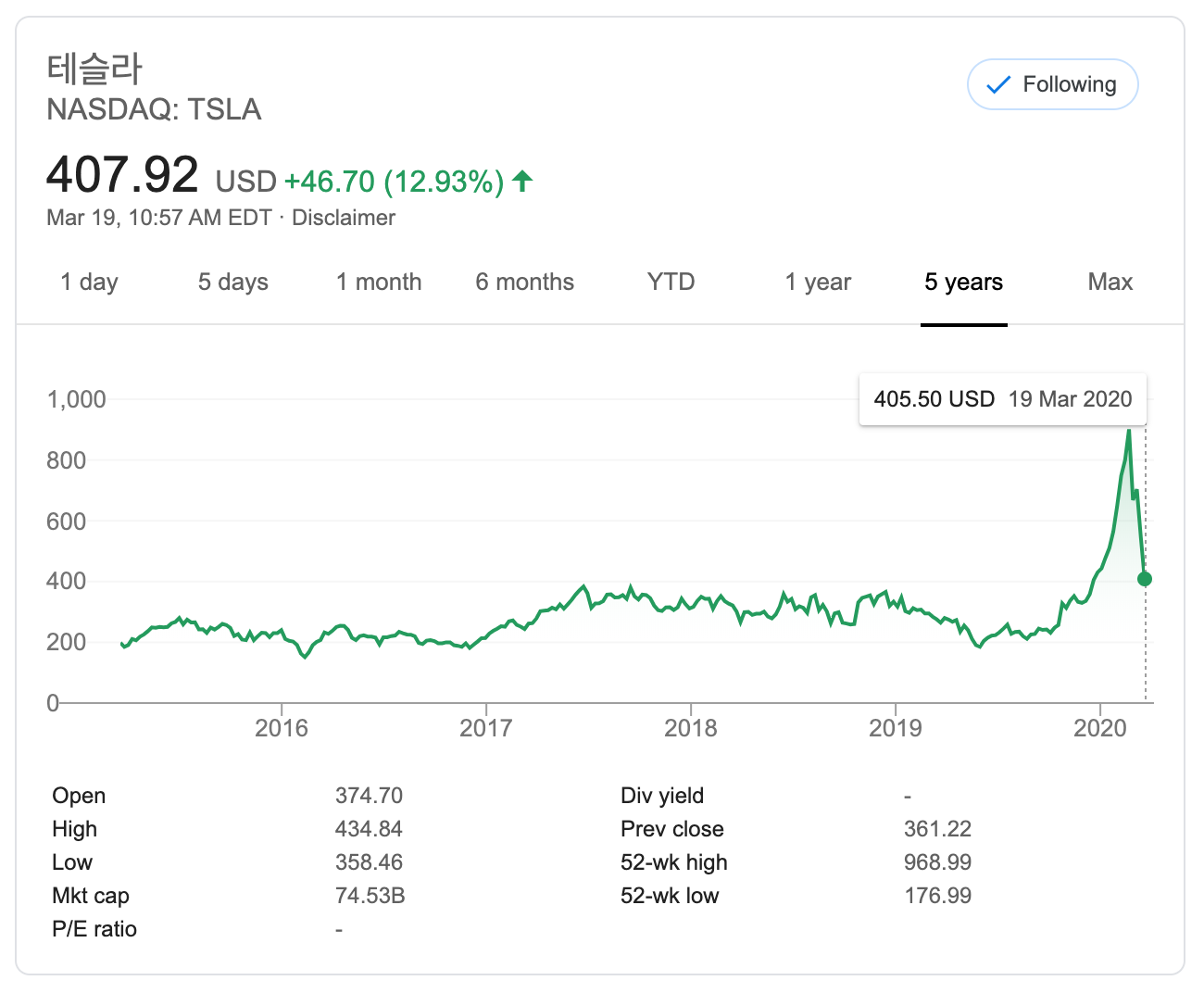$300 정도 하던 것이 갑자기 $900을 넘어갔다가 다시 $300 정도로 떨어졌습니다. 오늘 잠깐 회복해서 $400 정도가 되었지만 또 어떻게 될지 모르겠네요. 개인적으로 좋아하는 회사이기도 해서 주가가 떨어졌을 때 구입하고 싶습니다. 문제는 돈이 없다는 거겠네요 ^^; 아직 월급은 받고 살고 있으니 돈이 모이면 조금씩 사 모아 볼까 생각 중입니다. 돈이 모이면 다시 주가가 올라 버릴까 걱정이 되기도 하네요.