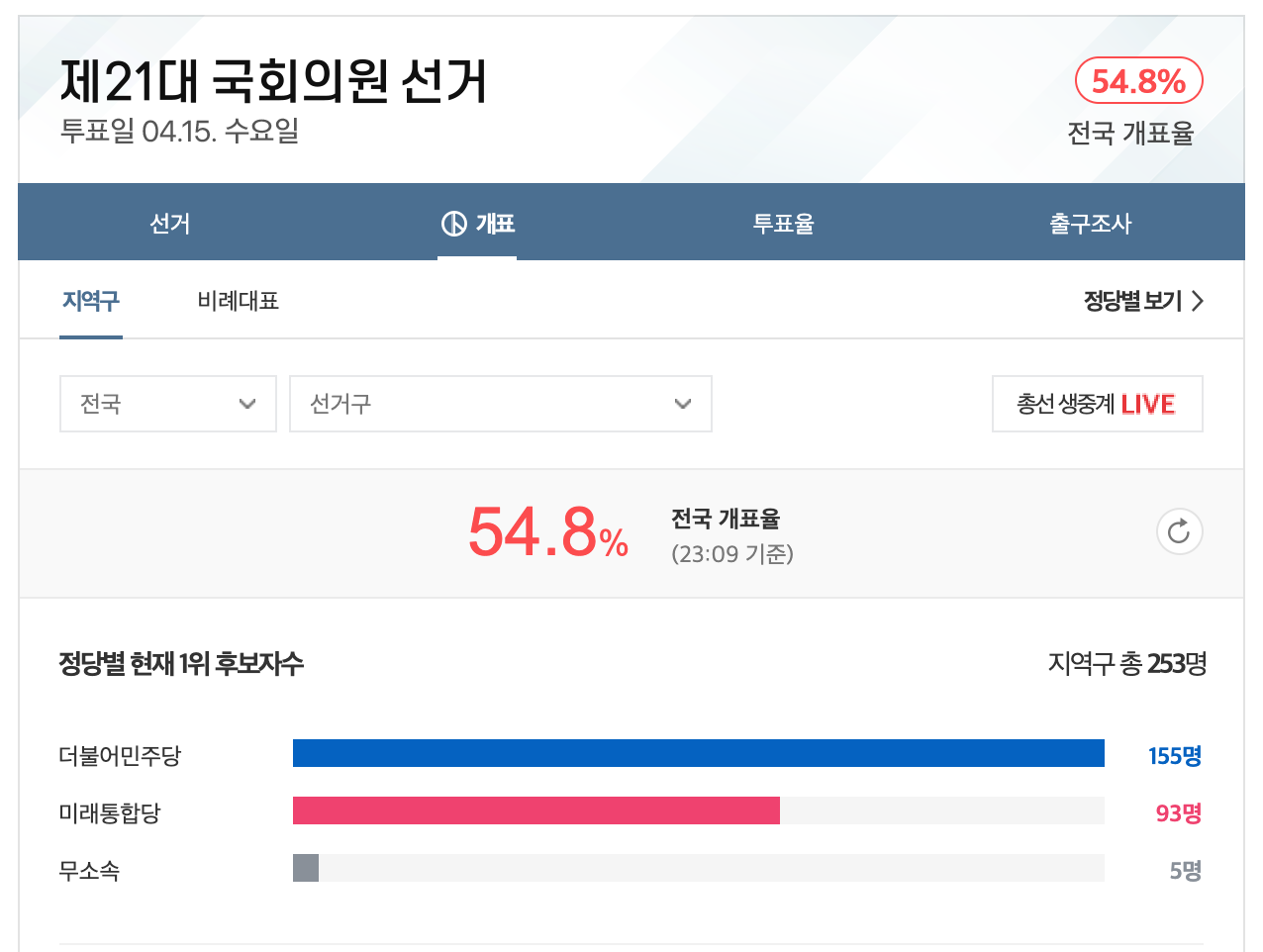 더불어민주당과 미래 통합당 너무 두 당 위주라서 조금 아쉽긴 합니다. 다른 당들도 좀 더 힘내 주었으면 좋겠습니다.