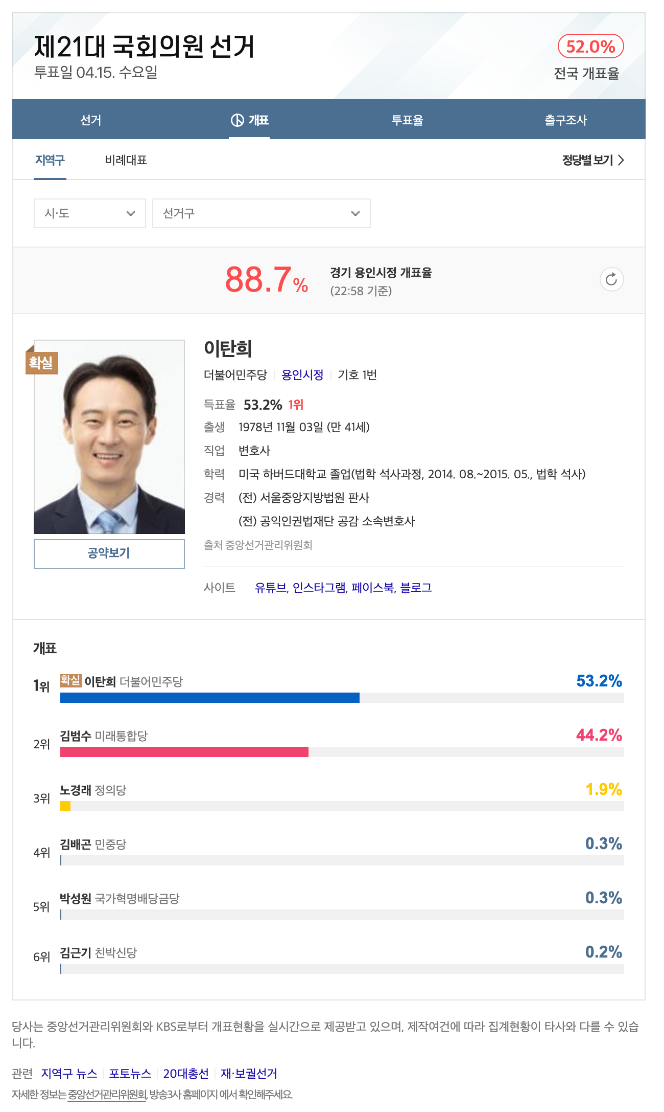 저녁이 되어서 개표방송이 한창인데요. 개표방송을 보면서 포털에서도 검색해 보았습니다. 저희 지역구에서는 이탄희 후보가 당선 확실 상태입니다.