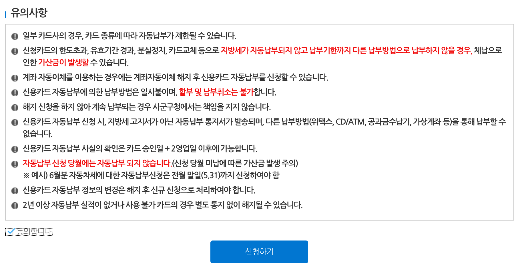 유의사항을 읽어보고 "동의합니다."를 선택한 후 아래쪽에 있는 "신청하기"버튼을 누릅니다.