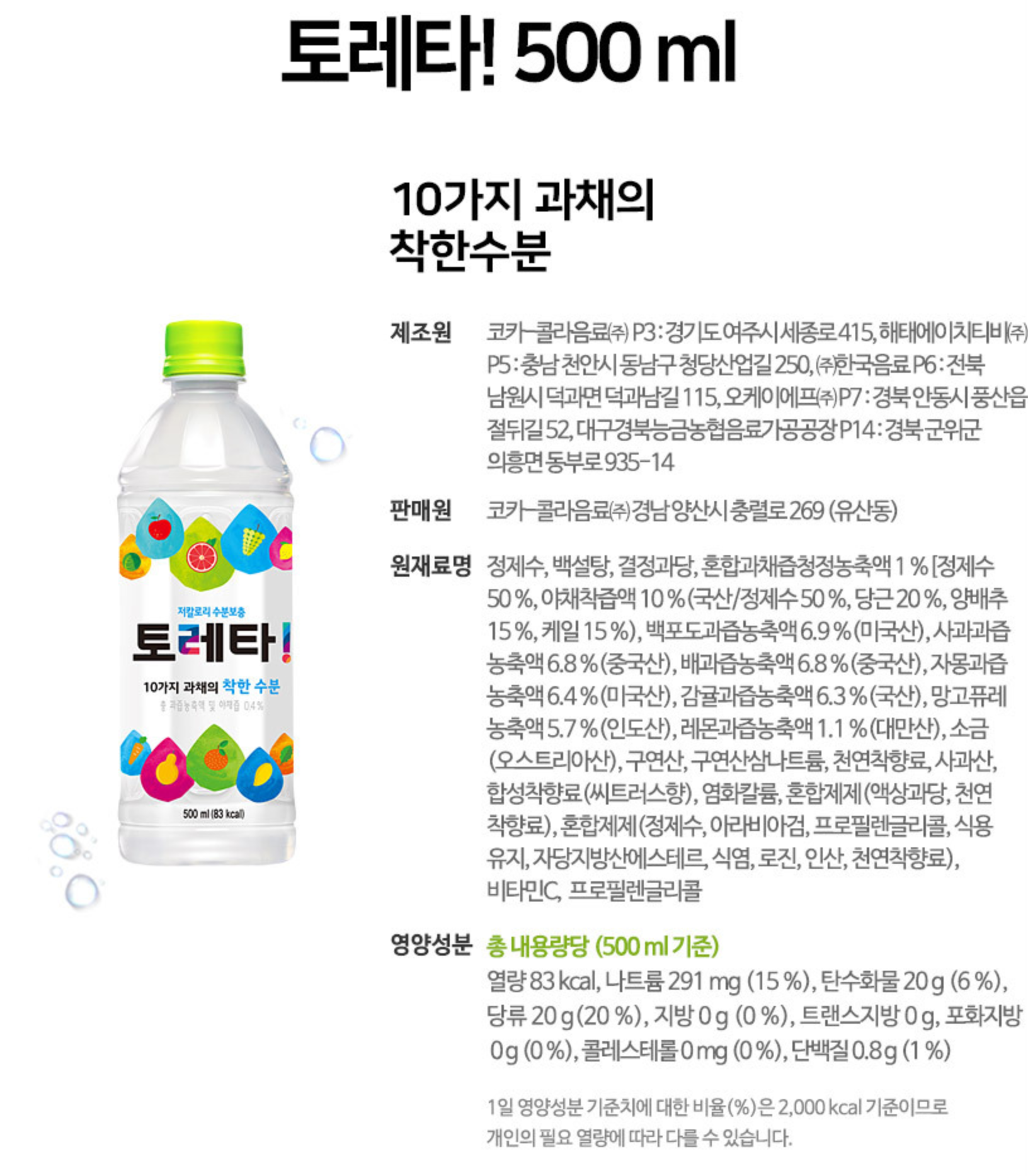 열량이 83kcal인데요. 같은 용량의 코카콜라에 비하면 1/3 수준입니다.