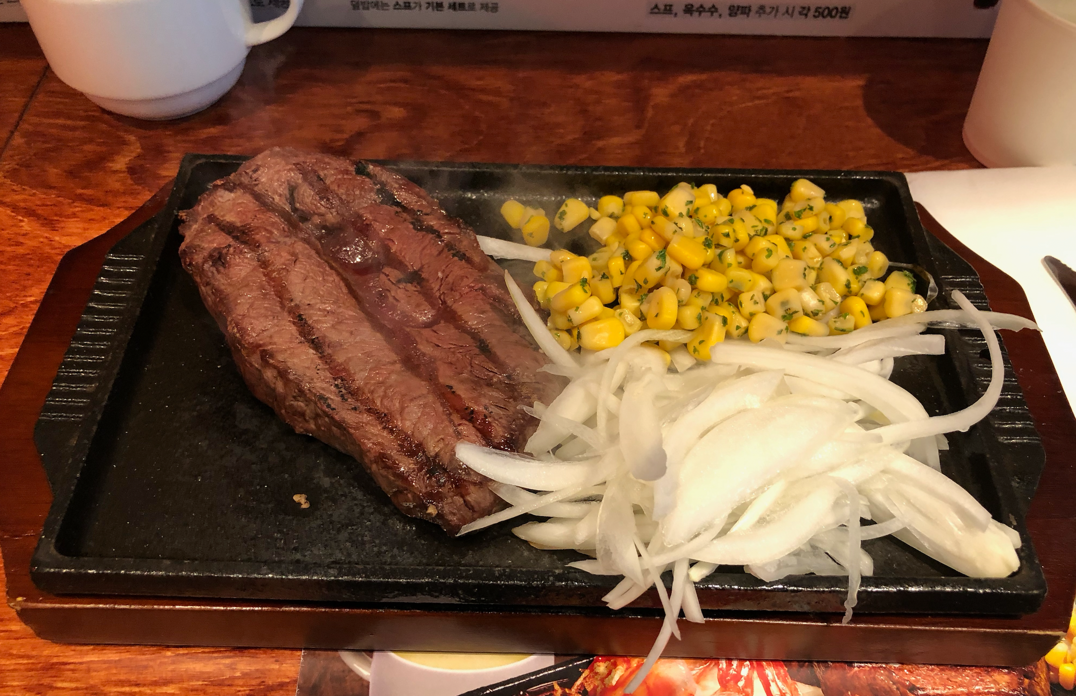 고기 가운데에 힘줄이 보이는 것으로 보아 부챗살이려나요? 스테이크와 함께 옥수수와 양파가 나옵니다.