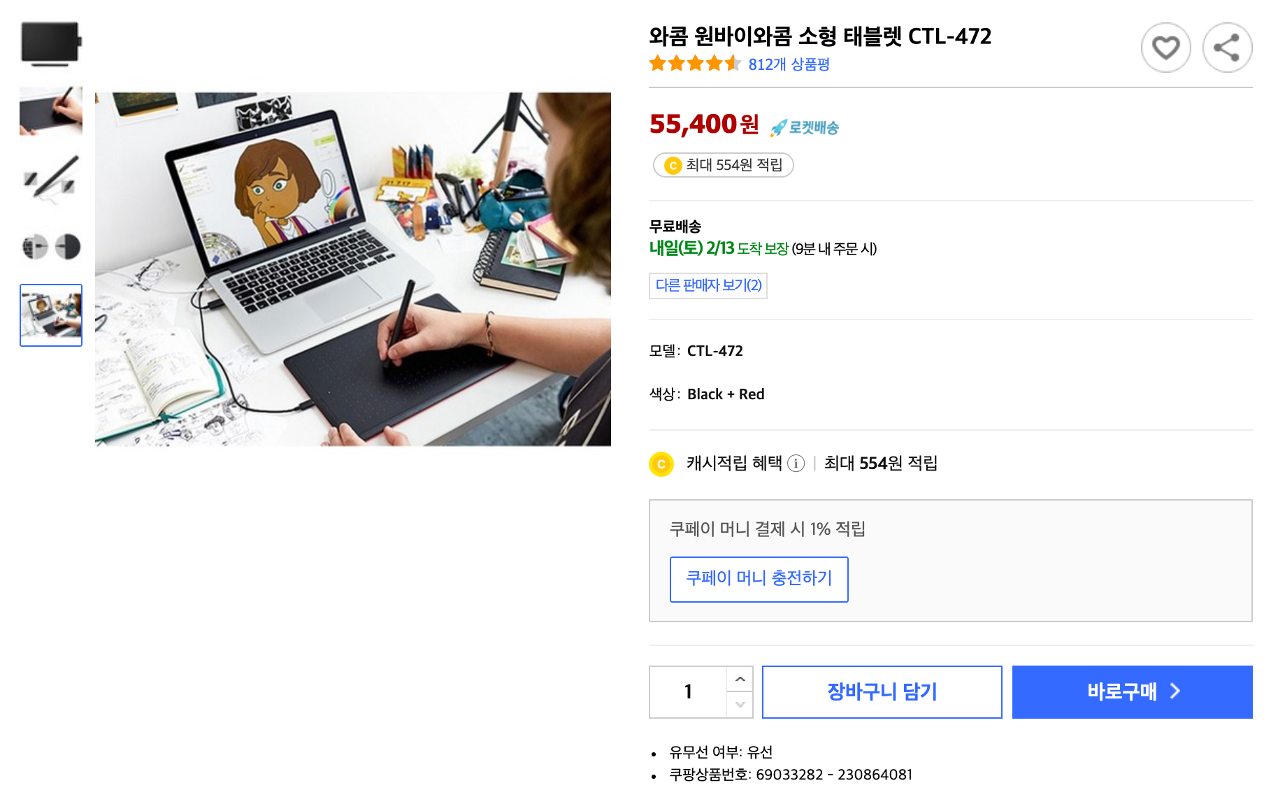 One by Wacom CTL-472 태블릿 주문. 모션 그래픽 수업 수강 준비물