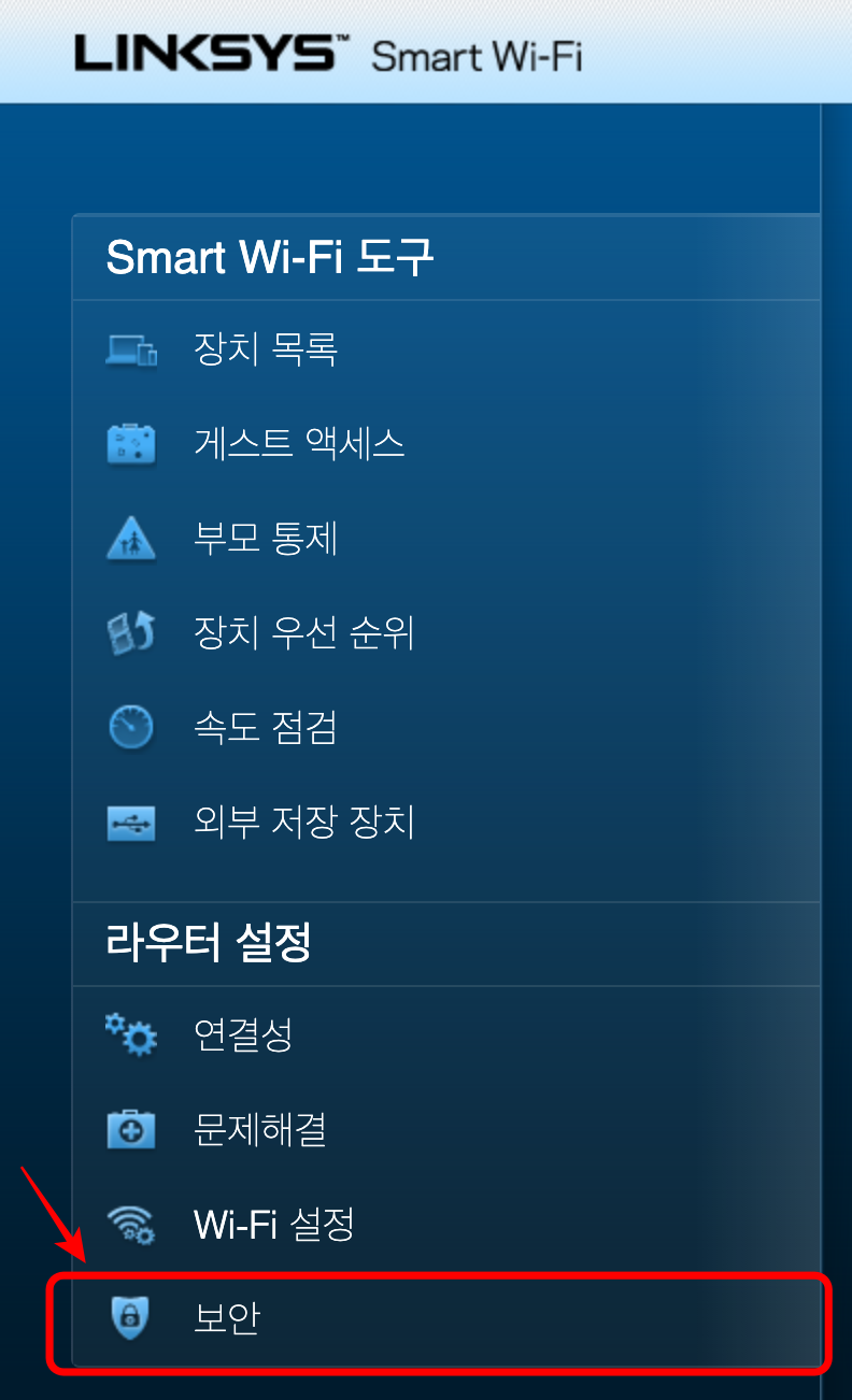 "라우터 설정 > 보안"으로 이동합니다. "연결성" 같은 설정에 있지 않을까 했는데 "보안"설정에 있더군요.