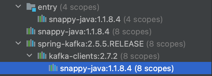 spring-kafka > kafka-clients > snappy-java 순서로 참조하고 있습니다.