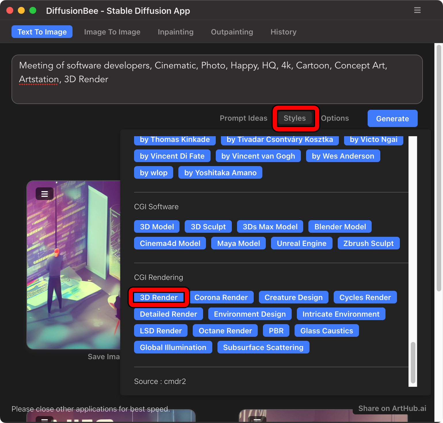 Prompt를 좀 더 자세하게 채워주면 좋은데요. 뭘 입력하면 좋을지 잘 떠오르지 않으니 입력창 아래에 보이는 "Styles"를 눌러서 몇 가지 떠오르는 스타일들을 선택해서 추가해 줍니다.