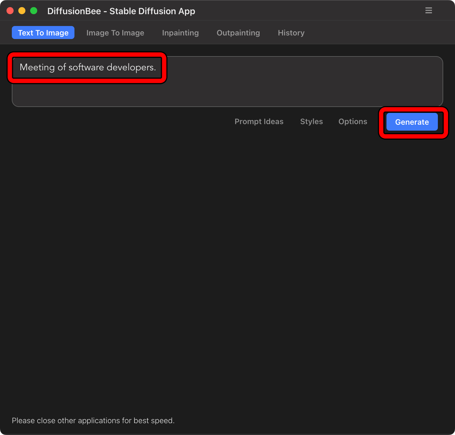 텍스트를 입력할 수 있는 부분에 Prompt를 입력합니다. 간단히 "Meeting of software developers."라고 입력하고 "Generate"버튼을 눌러 이미지 생성을 시작합니다. 아래 화면처럼 Generating이라는 문구가 보이고 이미지가 생성되는 프로그래스바를 볼 수 있습니다.