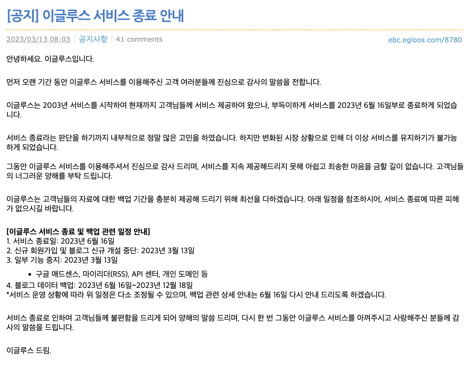 이글루스 블로그 서비스가 종료한다고 합니다. 2023년 6월 16일 예정 본문
