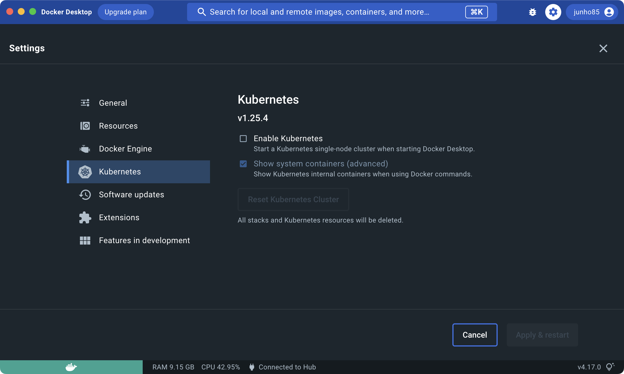 - 그리고 "Enable Kubernetes"설정을 해제합니다.