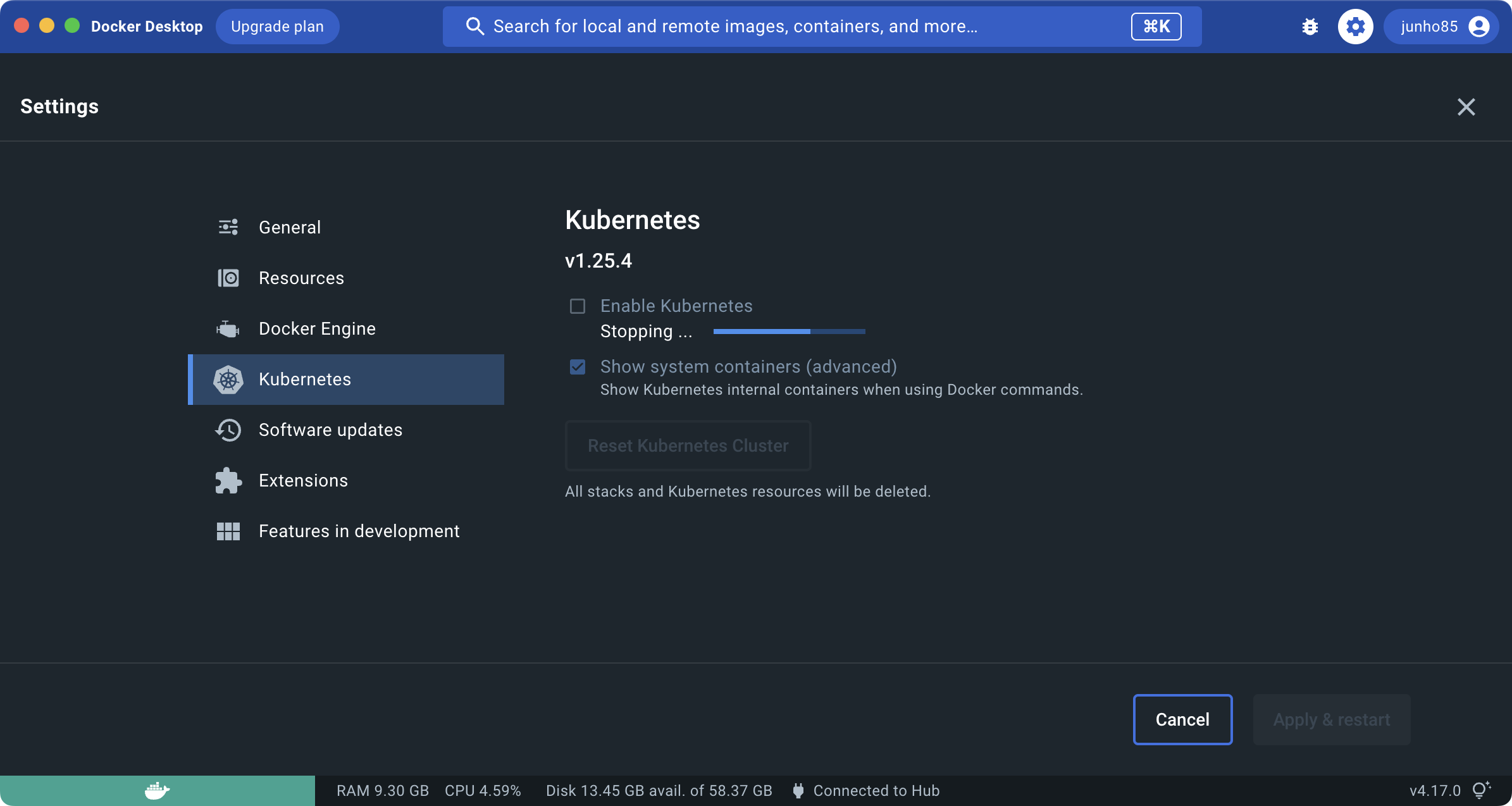 "Enable Kubernetes"선택을 해제하고 "Apply & restart"를 합니다. 이번에는 "Stopping ..."에서 멈춰있습니다.