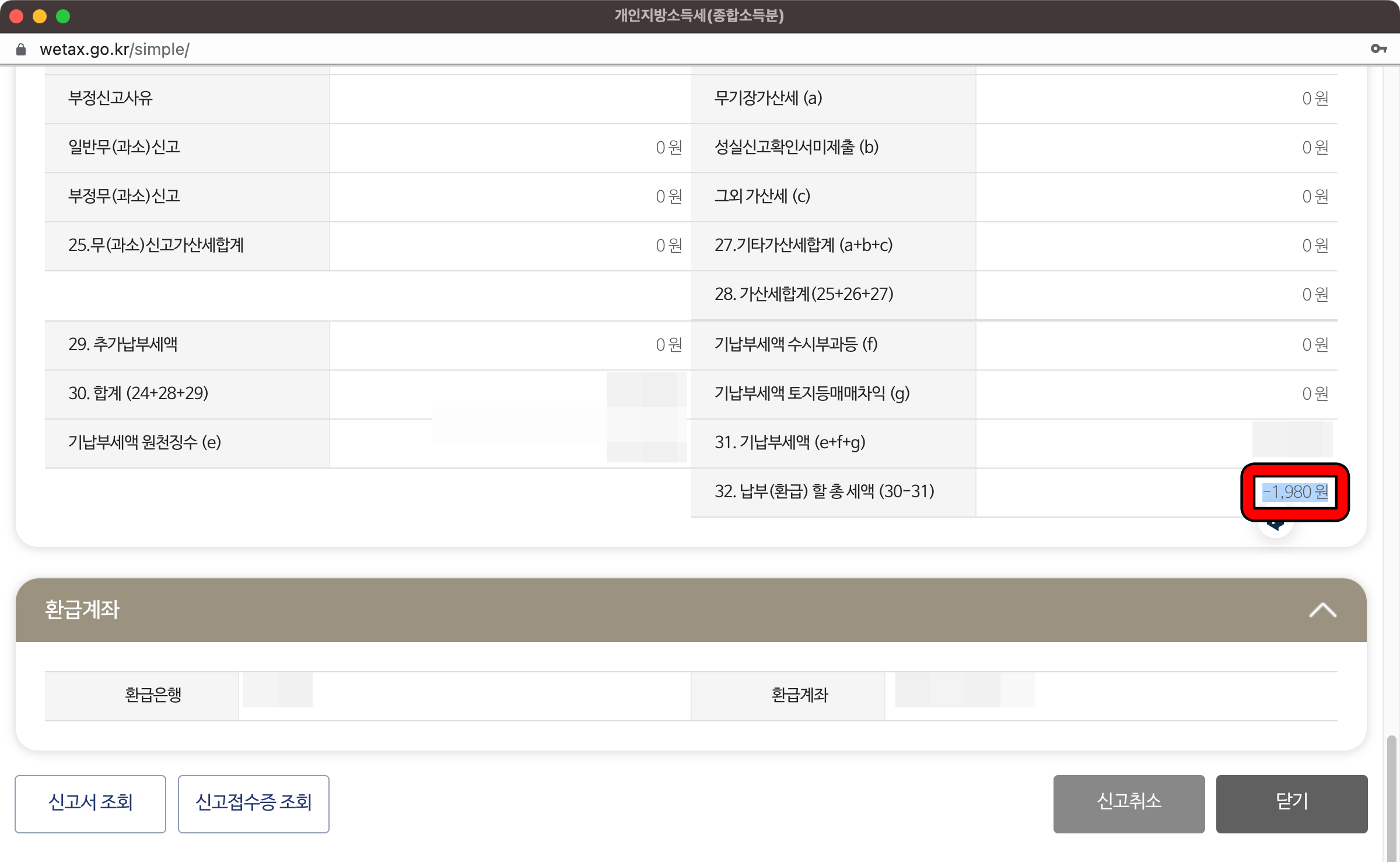 지방소득세는 종합소득세의 10%라서 1,980원을 환급받네요. 계좌정보도 자동으로 다 입력되어 있어서 편리합니다.