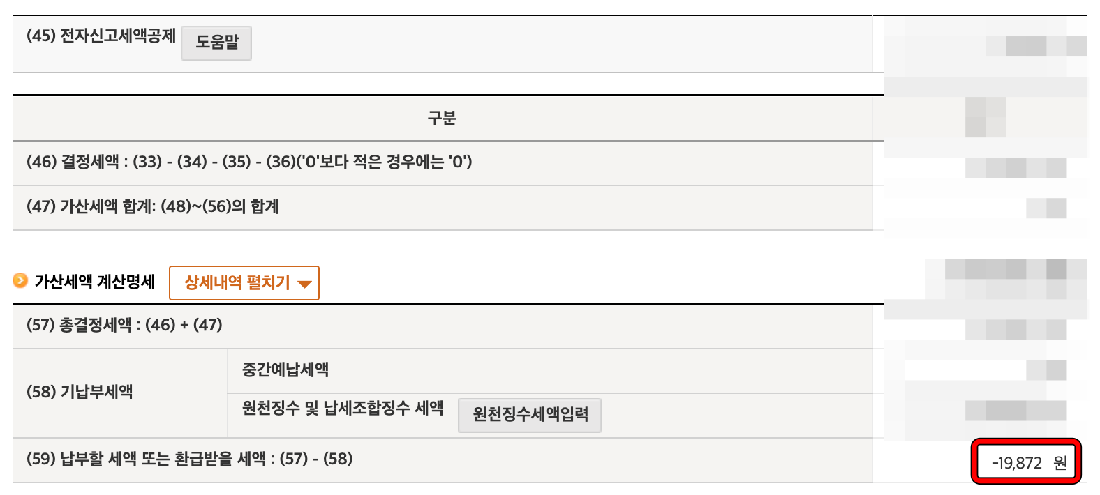 왜인지는 잘 모르겠지만 -19,872원이라고 나오는 것으로 보아 환급받는 금액이 있네요?