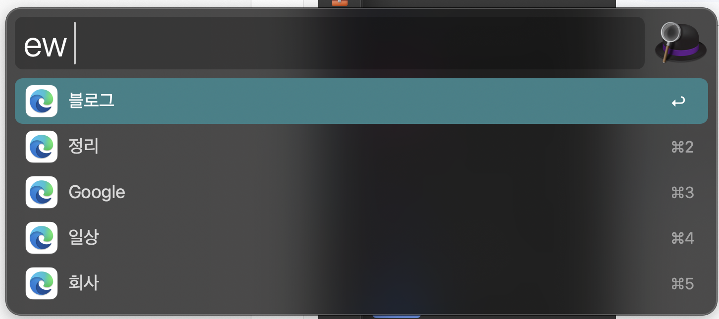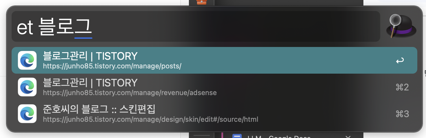 Alfred Workflow 중 개인적으로 가장 많이 사용하는 것이 Browser Tabs입니다. 저는 Edge Tabs 단축키를 더 줄여서 "et", Chrome Tabs 단축키를 더 줄여서 "ct"로 사용하고 있는데요. "et 블로그"라고 입력하면 Edge Browser Tab들 중 "블로그"라는 단어가 들어간 탭을 검색해 줍니다.