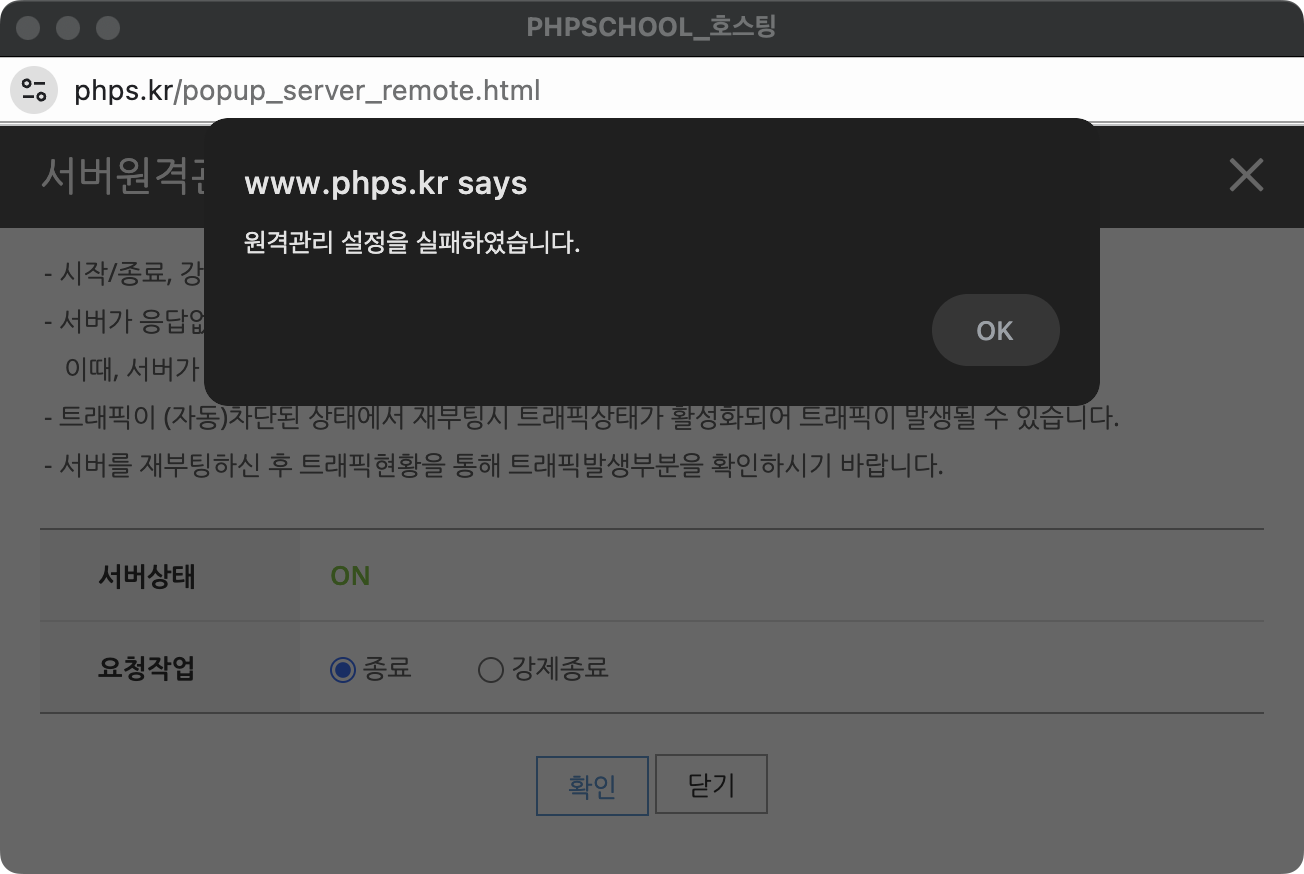 하지만 서버상태가 좋지 않은 경우 "원격관리 설정을 실패하였습니다." 메시지가 나타나면서 종료에 실패하게 됩니다.